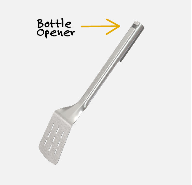 The tongs feature a locking mechanism and a built-in bottle opener—because outdoor cooking should be functional and fun.