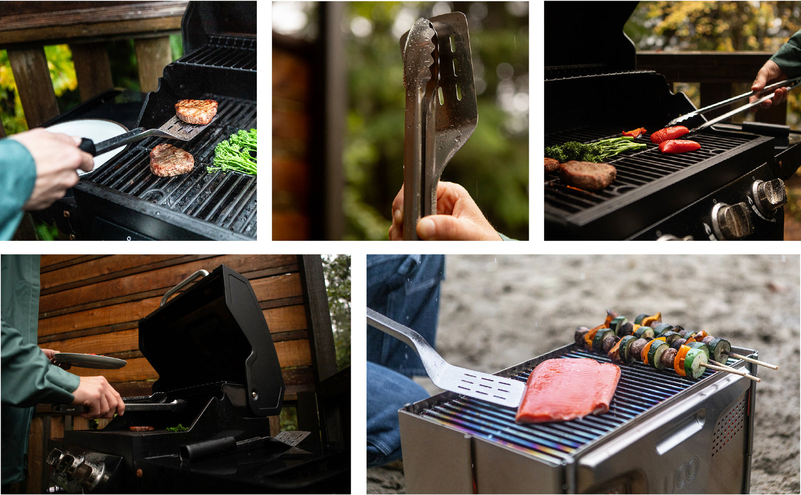 Designed to pair perfectly with your portable camping grill, the nesting design keeps your tools compact and organized—ideal for vanlife setups, tailgates, or backcountry cookouts. The stainless steel grilling tools are built to handle high heat and rugged conditions, while the spatula’s eco-friendly Recover Recycled™ Polypropylene handle helps reduce plastic waste.