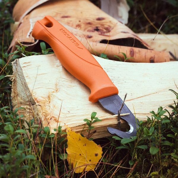 The ergonomic polymer handle has a sturdy finger guard and a 2.0 mm thick, curved blade made of recycled Swedish stainless steel, which provides both strength and stability in every pulling cut. Thanks to the blade and handle design, the knife is optimal for working safely and efficiently in various weather conditions all year round. Knife sheath made of polymer.