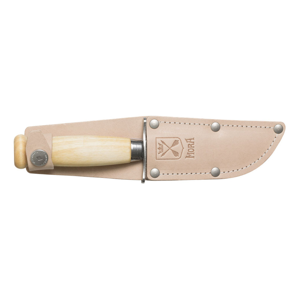 With a barrel-shaped handle of Scandinavian birch wood, double finger protection and a 2.0 mm thick blade with a rounded tip of recycled Swedish stainless steel, the knife is always ready for the next project. Thanks to a smaller handle geometry, the knife rests comfortably in a small hand. The knife’s full rat-tail tang, which runs through the entire handle, provides both strength and stability in each cut. The knife sheath made of vegetable tanned leather in its natural colour has a belt strap that can be easily attached to a belt and for safety's sake, it is equipped with a simple and classic click-button that secures the knife in the knife sheath. The embossed coat of arms from Dalarna on the knife sheath is a well-preserved detail from the past. The knife sheath should always be mounted on the knife when it is not in use to carefully protect both the user and the sharp edge. When in contact with surfaces other than wood, the edge may become dull. Children's knife handling should always take place under adult supervision. Ever since they were first introduced in the 1930s, the characteristic Scout knives have been an obvious entry-level knife for children and a door opener for a richer outdoor life.