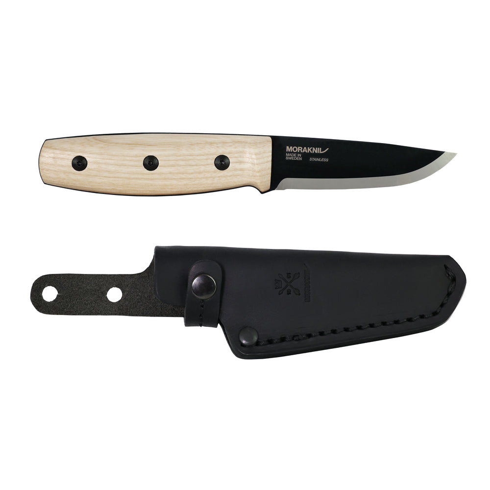 The ergonomic handle and finger guard are made of carefully selected ash wood from European FSCⓇ certified forests, and the 2.0 mm thick recycled Swedish stainless steel blade provides both strength and stability in every cut. A beautifully balanced contrast between the bright ash wood and the shiny edge of the blade is made possible by the black PC-coating. Keep the sharp edge of the knife protected with a vegetable tanned leather sheath.